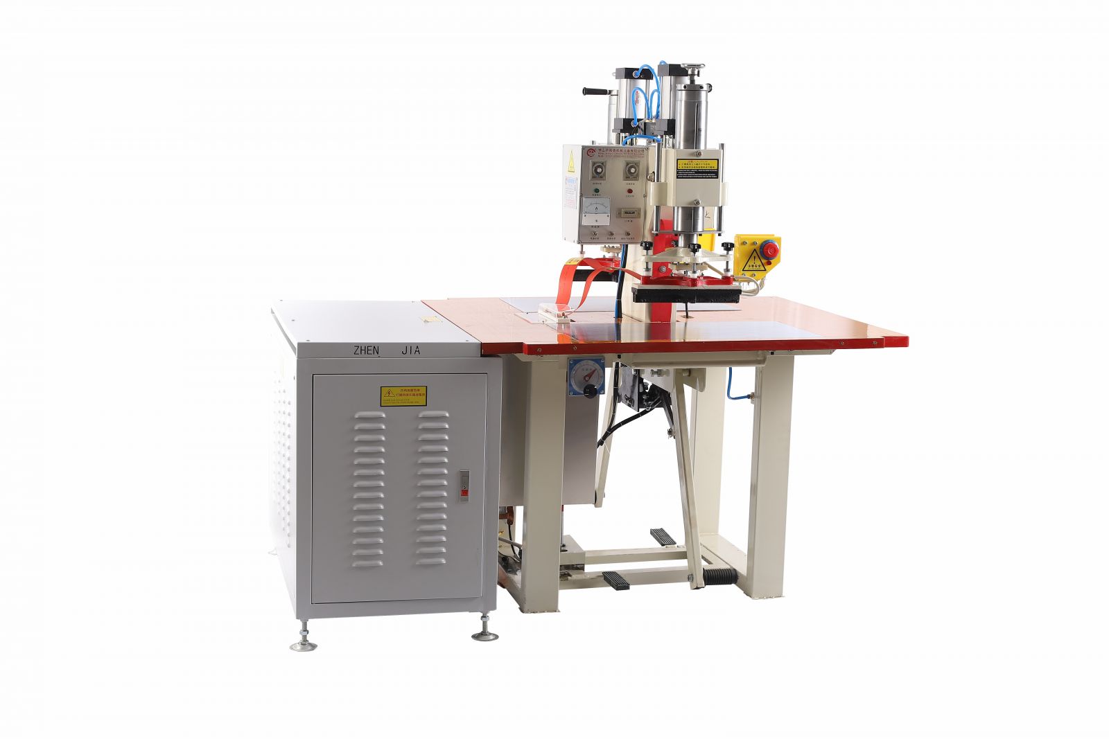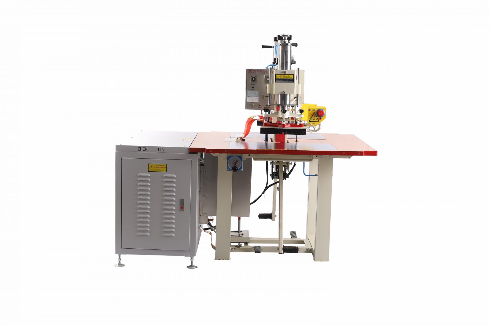 高頻熱合機:操作工作臺面板分別為機頭的兩邊,操作方式主要是由操作人員右腳踏定位和左腳開關,焊接過程由時間自動控制,左右機頭交替使用。機型主要有ZJ-5K-TR,ZJ-8K-TR。