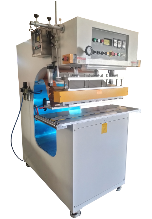 本機屬高頻設(shè)備,由電子管自激振蕩器產(chǎn)生高頻電磁場,被加工塑料在上、下電極間的高頻電磁場中,其內(nèi)部分子被極化而相互運動磨擦自身產(chǎn)生熱量,在模具的壓力下達到熔接目的。
