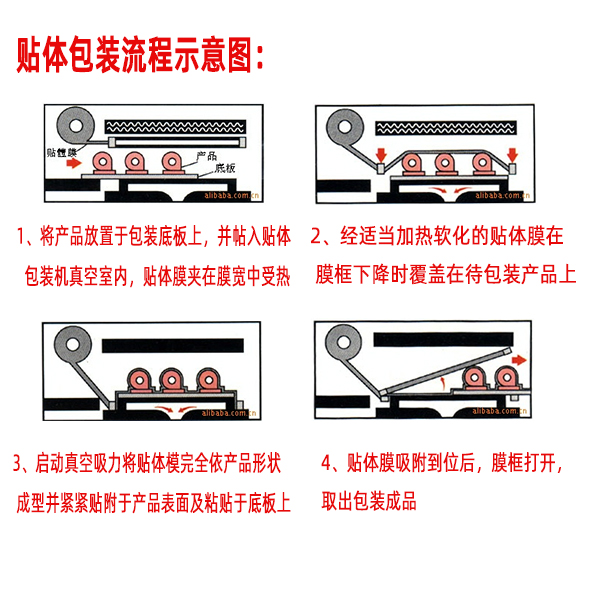 把貼體膜料裝好在貼體機上,貼體機的工作臺放好紙卡,然后在紙卡上放好產(chǎn)品。把貼體膜料拉過去,按下按鈕,就可以包裝好產(chǎn)品,最后把產(chǎn)品拉出來,就可以繼續(xù)下一個產(chǎn)品的制作。